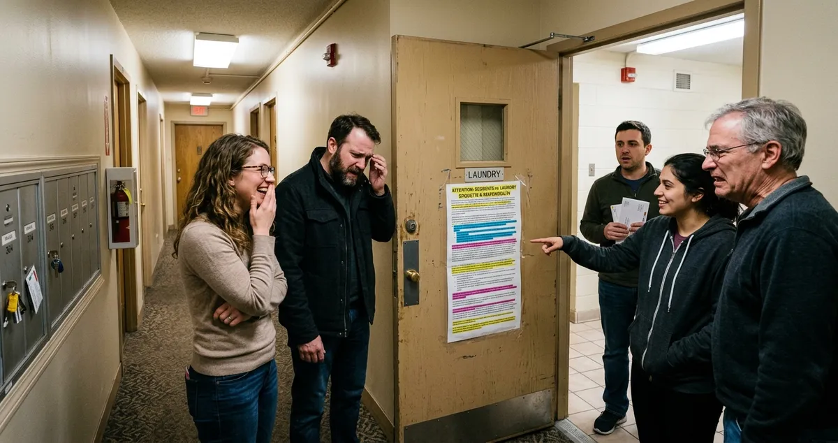 The basement laundry room of 3242 North Sheffield Avenue is not large. It contains four washers, three dryers (one perpetually out of order), a folding table with a wobble, and, as of this week, fourteen laminated notes engaged in what residents have begun calling “the discourse.” The discourse started with lint. It has since expanded to encompass load timing, detergent brand selection, the ontological status of “forgot” versus “chose not to,” and at least one reference to the Geneva Convention.