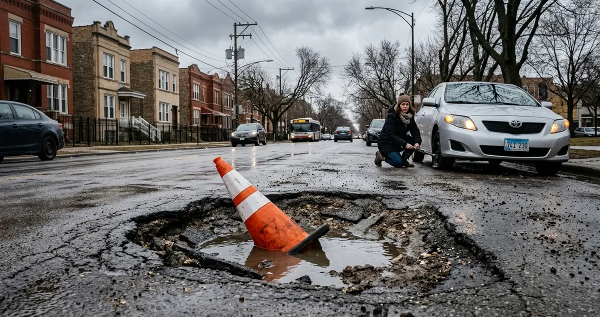 There is a sound that every Chicagoan knows but no one talks about — a low, percussive thud followed by a metallic shudder that rises through the floorboard, through the seat, through the spine, and settles somewhere behind the eyes as a quiet, personal reckoning. It is the sound of a tire meeting a pothole, and it is, as of this week, the unofficial soundtrack of the city.
