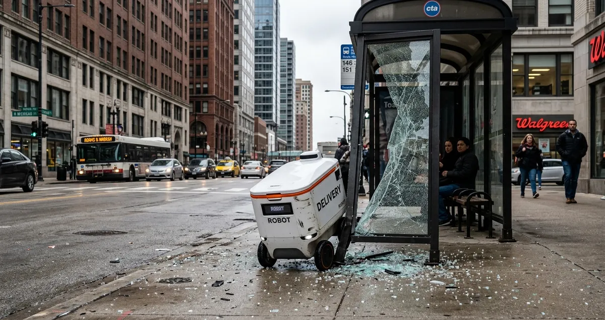 The first incident involved a Serve Robotics unit at the intersection of Racine and West Chicago Avenue in West Town, where surveillance footage captured the robot approaching a bus shelter at what witnesses described as “a confident pace” before making contact with the glass panel. The second, days later, involved a Coco Robotics unit at a nearby location and resulted in similar structural consequences. Both incidents produced broken glass. One produced viral video. Neither produced a satisfying explanation.