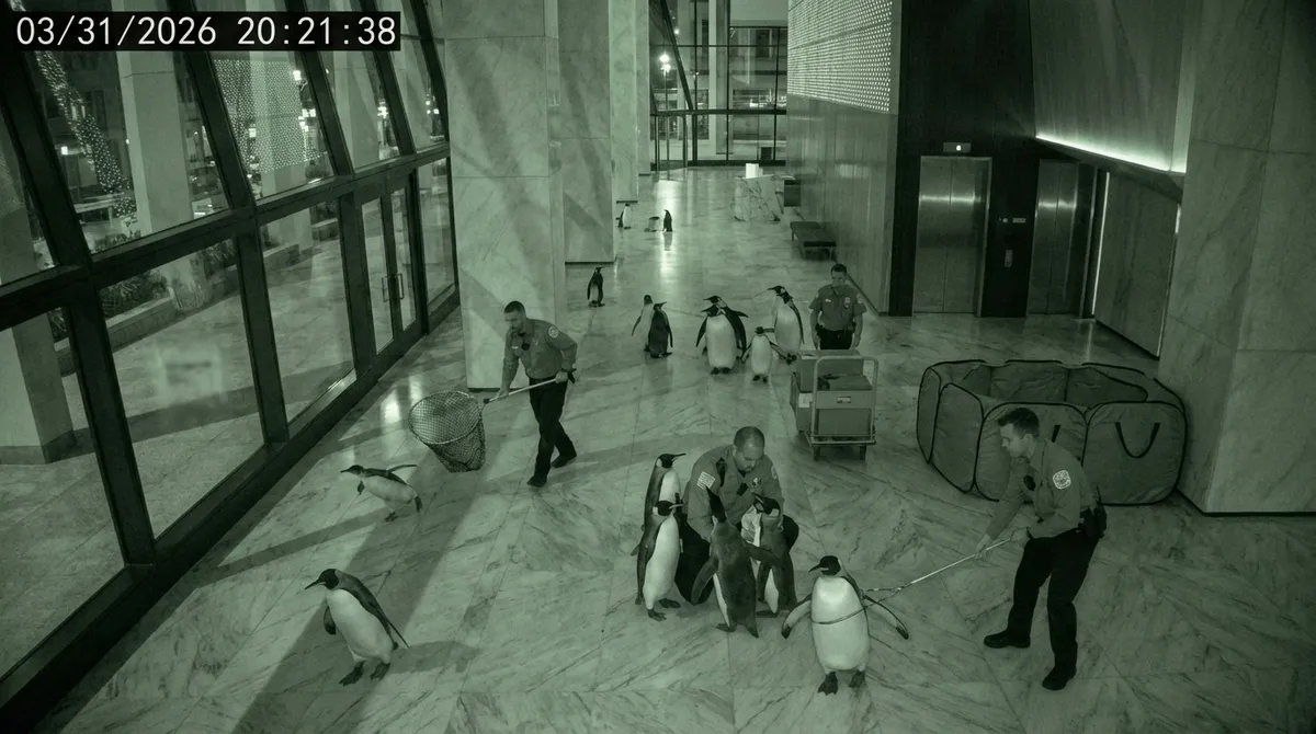 According to building security, surveillance cameras on the loading dock and freight elevator were looped starting at approximately 5:40 PM on Tuesday — just as the last employees were leaving for the day. The feeds showed the same twelve seconds of empty hallway on repeat. Security did not notice the loop until roughly ninety minutes later, when a guard reviewing a routine check spotted penguins wandering past a camera on another floor.