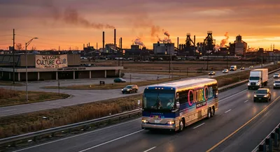 The city of Gary, Indiana entered a heightened state of anticipation Saturday as word spread that Boy George and Culture Club's tour bus had been spotted on I-90 heading northeast, with arrival at the Genesis Convention Center expected sometime before 8 p.m., pending traffic.
