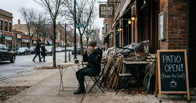 A single customer was observed drinking coffee outdoors at a cafe on Clark Street in 48-degree weather, marking the unofficial start of Chicago's most psychologically complex dining season.